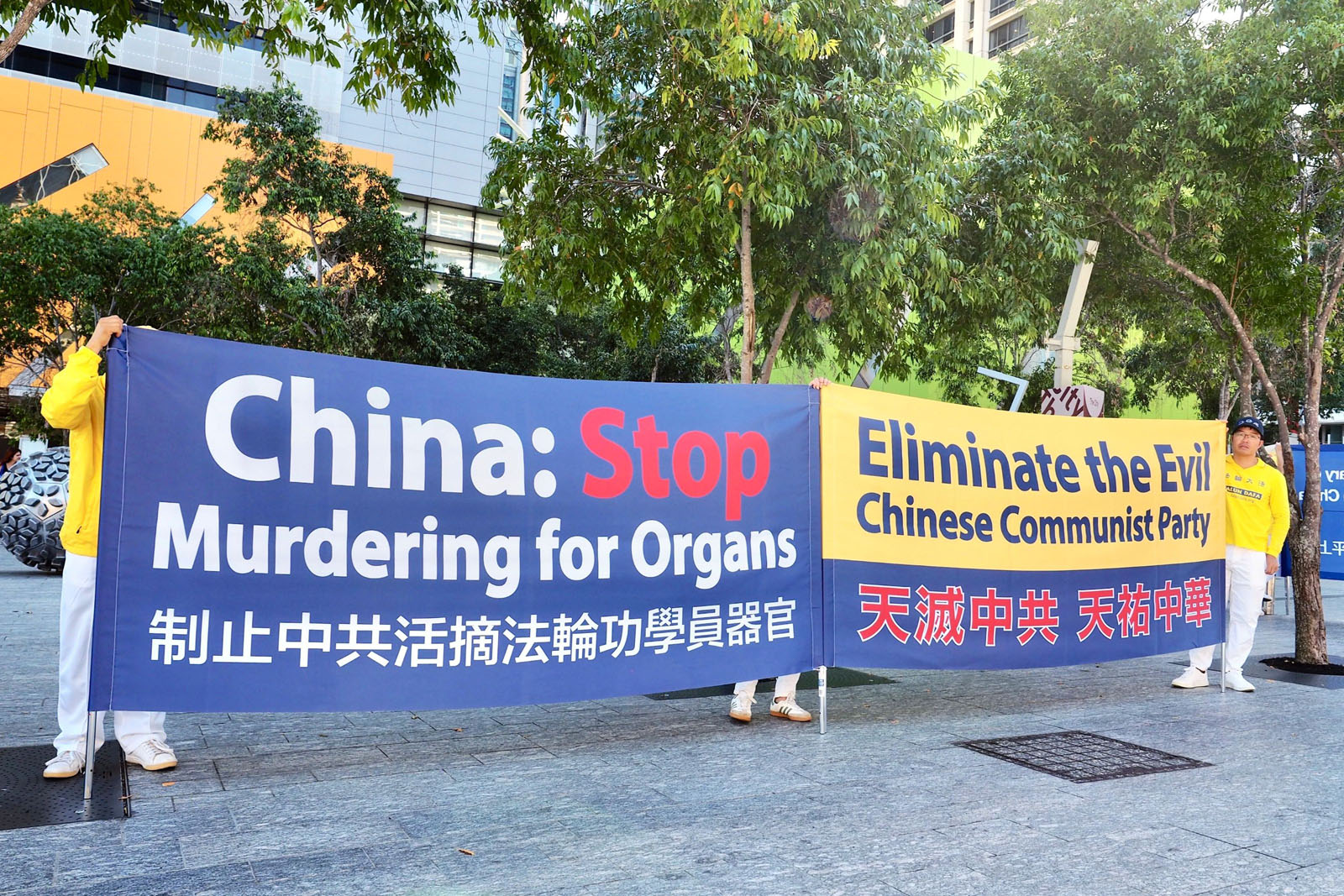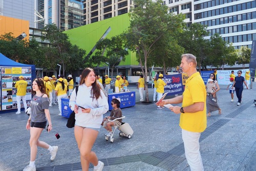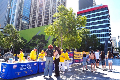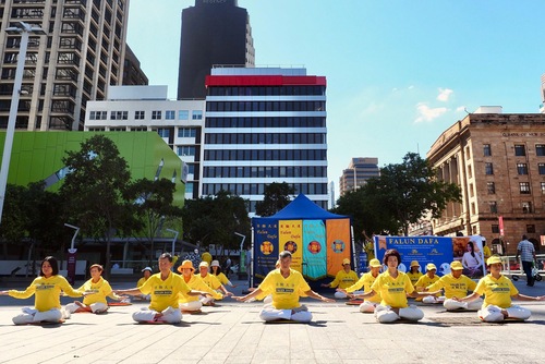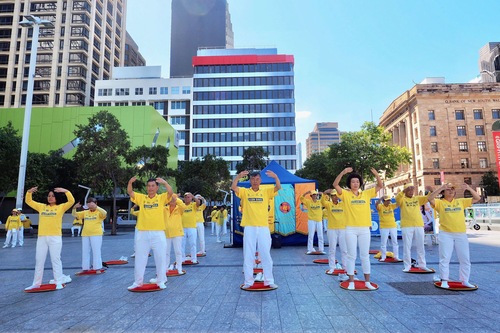 Практикующие Фалунь Дафа проводят мероприятие на площади Брисбена, чтобы отметить годовщину мирного обращения «25 апреля»