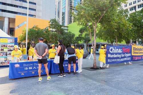 Проходившая мимо супружеская пара из Китая остановилась возле информационных стендов. Они прочитали информацию и внимательно выслушали практикующих. Супруги узнали, что мероприятие посвящено 27-й годовщине мирного обращения «25 апреля». В тот день 10 000 практикующих Фалунь Дафа собрались в Пекине, чтобы рассказать центральному правительству о том, какую пользу они получили от практики Фалунь Дафа, и потребовать немедленного освобождения незаконно задержанных практикующих в Тяньцзине, разрешения на легальное издание Книг Фалунь Дафа, а также отстоять своё право свободно выполнять упражнения.