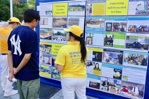 Практикующие установили плакаты с информацией о преследовании Фалунь Дафа компартией Китая
