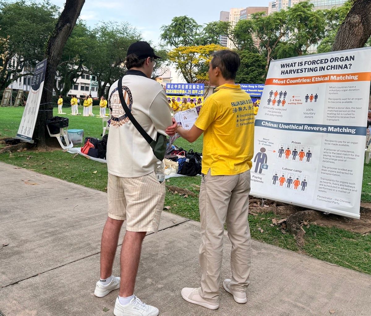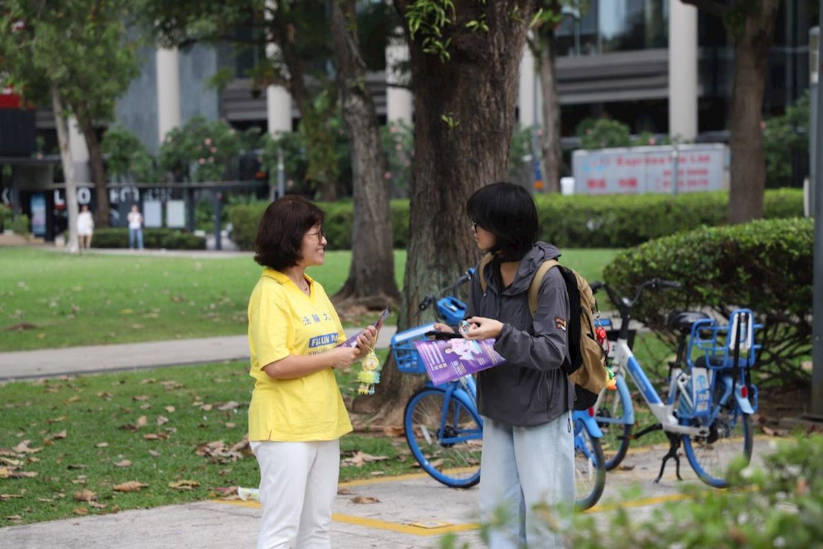 Молодой человек из Китая, который с визитом приехал в Сингапур, сказал, что почувствовал атмосферу свободы. Он внимательно выслушал объяснение практикующего о том, что подавление практикующих Фалунь Дафа компартией Китая является преследованием всего китайского народа, и это подавление доброты ведёт к моральному упадку и нарушению законов. Таким образом, последствия этих репрессий отразятся на всех. В ответ молодой человек сказал: «Я понимаю всё, что вы сказали».