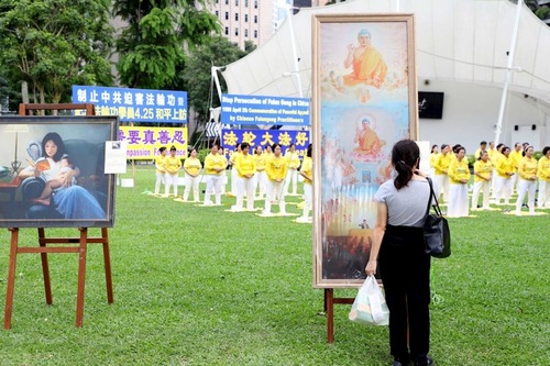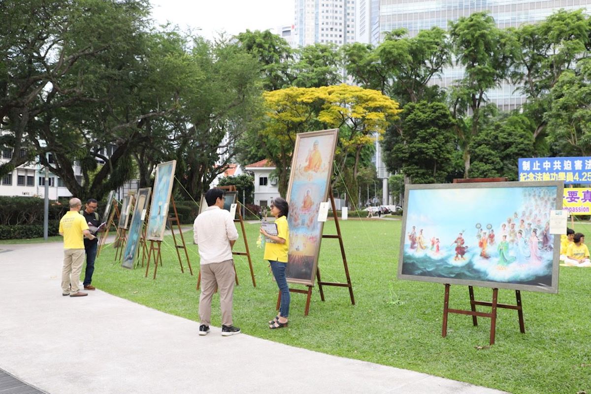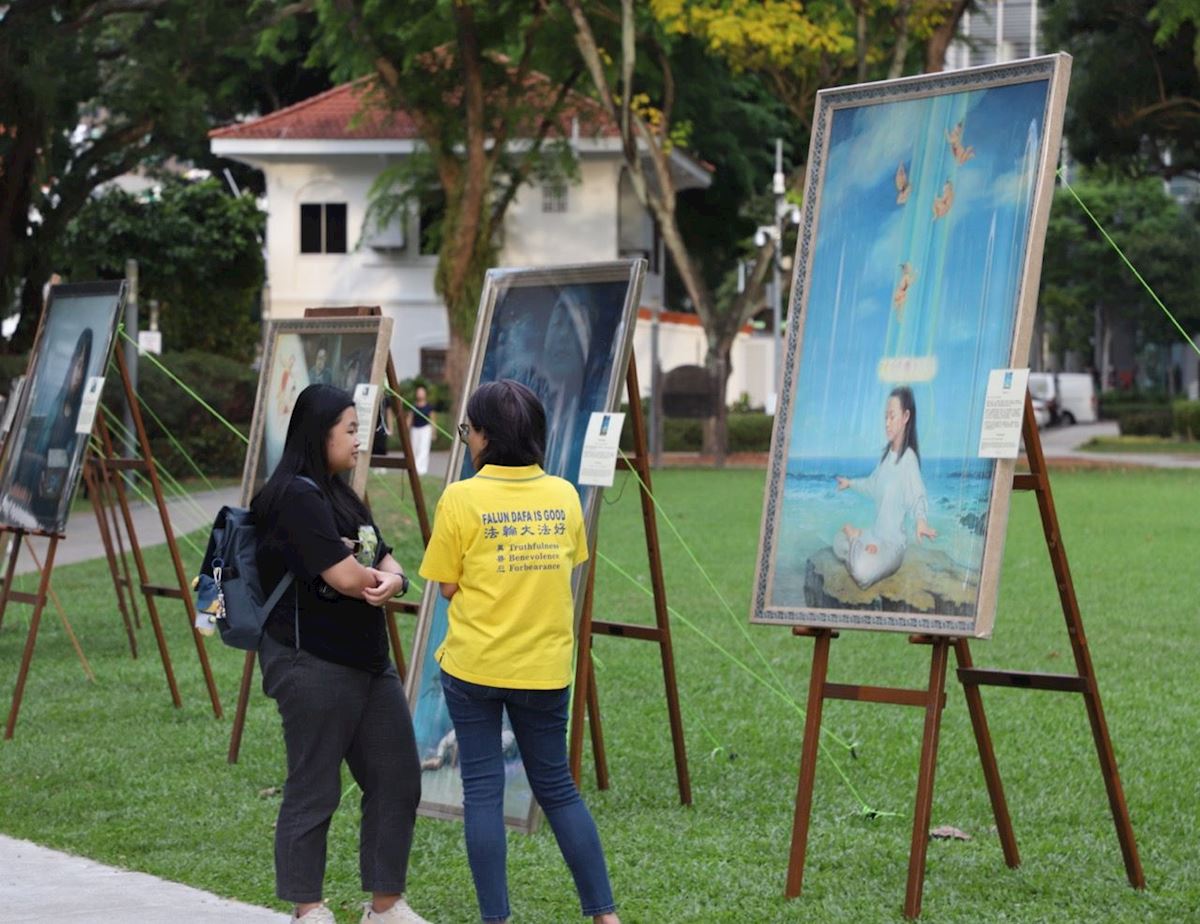 Многие посетители останавливались у работ выставки «Искусство Чжэнь Шань Жэнь», которые были выставлены в рамках мероприятия. Они беседовали с практикующими, знакомились с историей создания этих произведений и узнавали о преследовании, которое инициировала компартия Китая против людей с духовными убеждениями. Некоторые говорили, что чувствуют энергию, которую излучают картины, а другие были глубоко потрясены услышанным о преследовании. Джереми, тридцатилетнего жителя Сингапура, заинтересовала картина «Передача Фа». Практикующая рассказала ему о Фалунь Дафа и пригласила на бесплатный девятидневный курс. Она также пояснила, что Ассоциация Фалунь Дафа в Сингапуре является официально зарегистрированной организацией, и рассказала о жестоком преследовании в Китае.