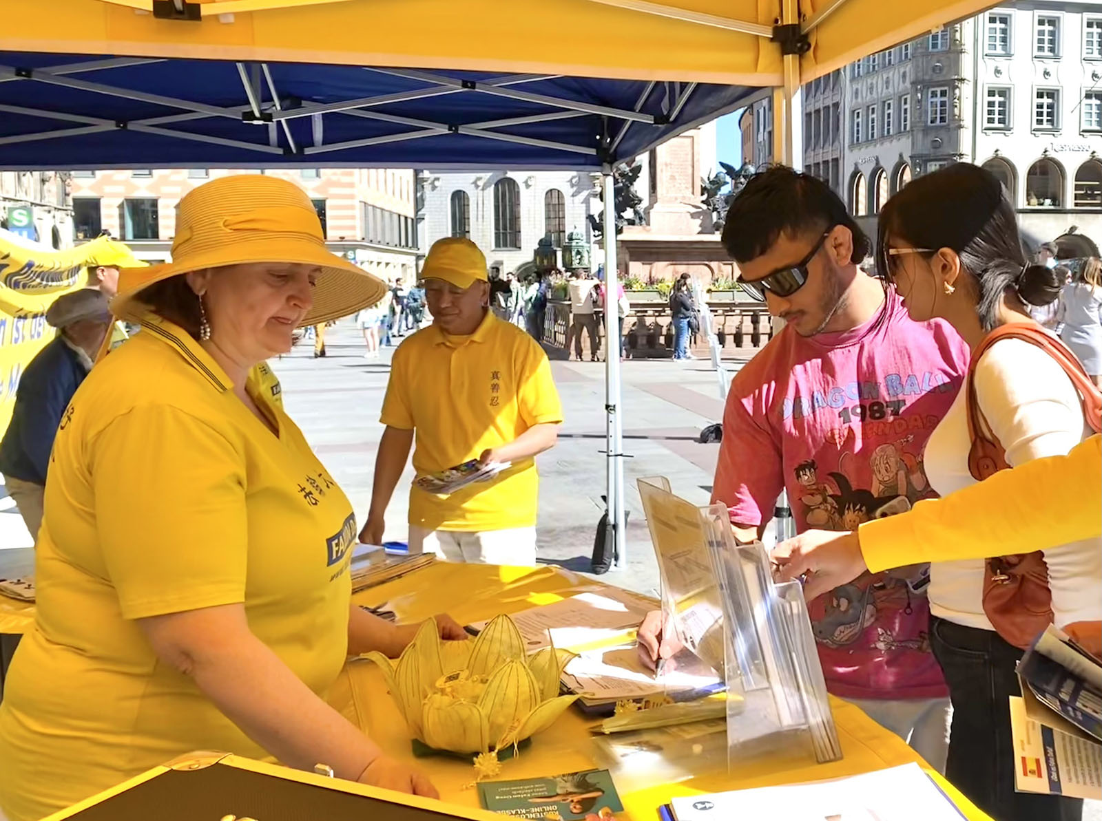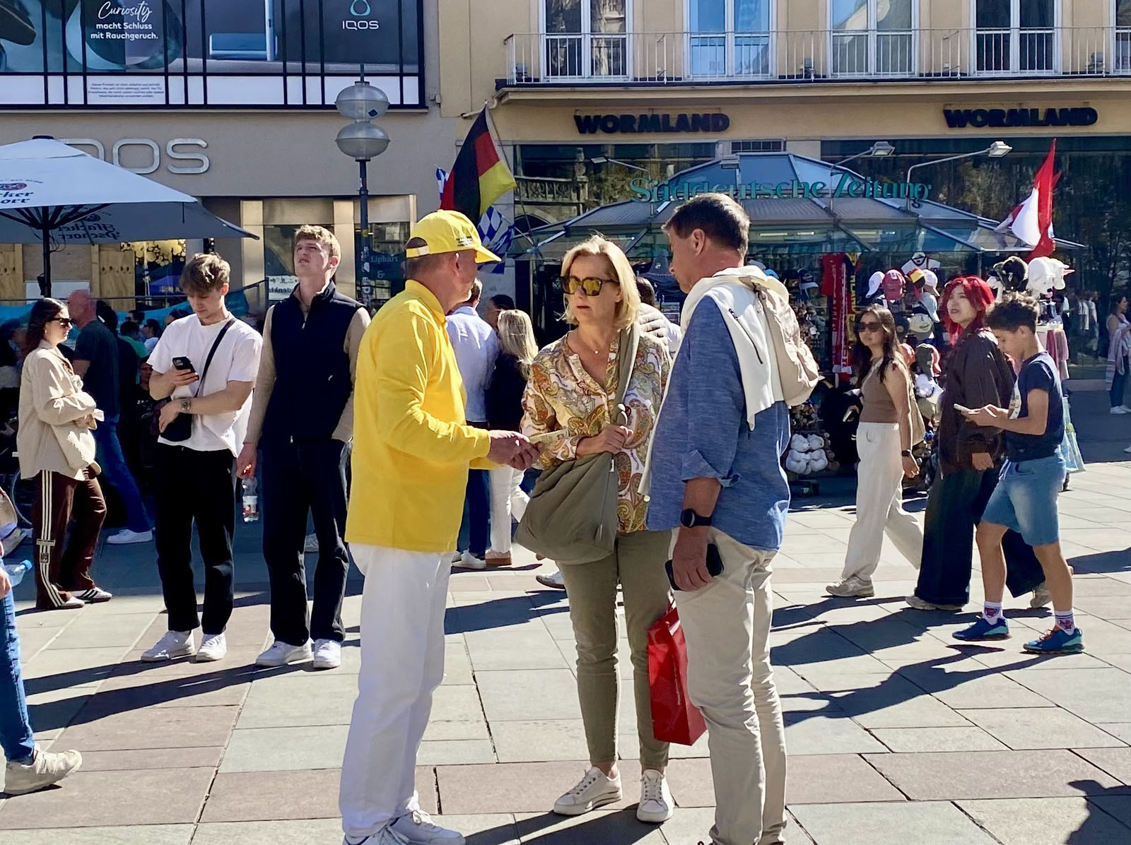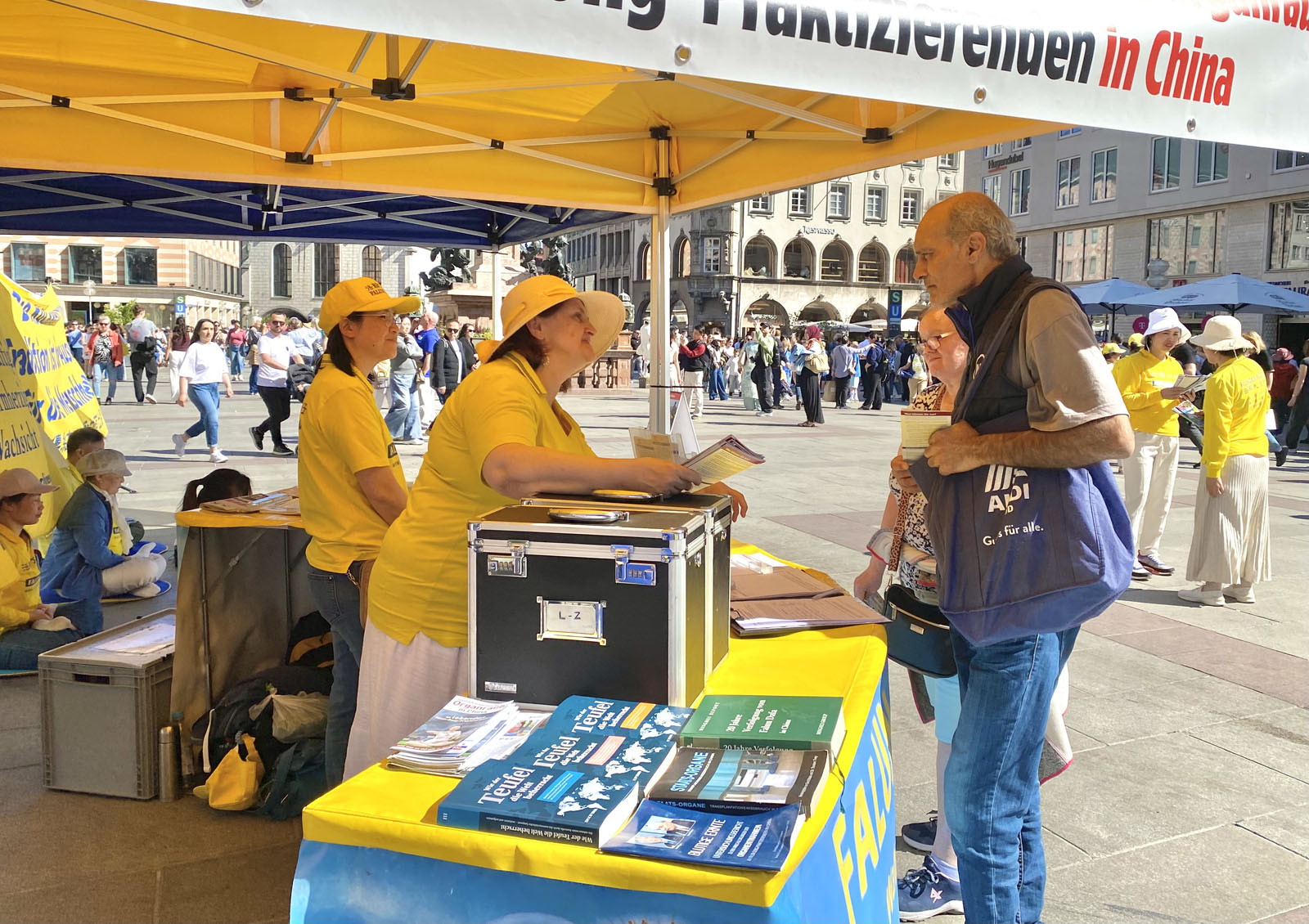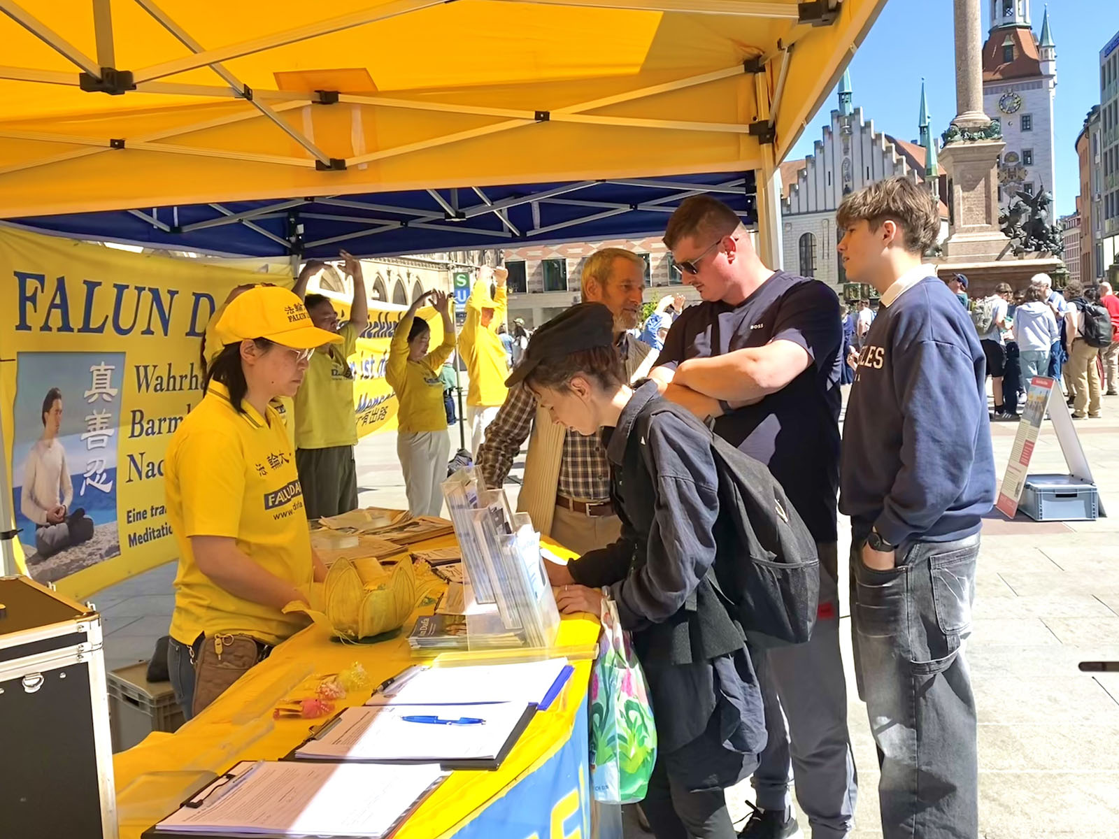 Художница Йоханна остановилась у палатки на Мариенплац и пообщалась с последователями Дафа.