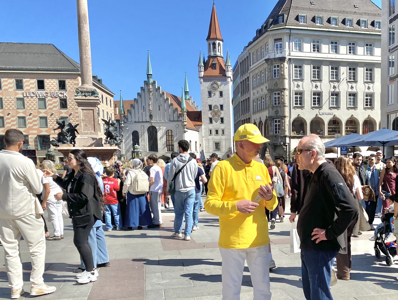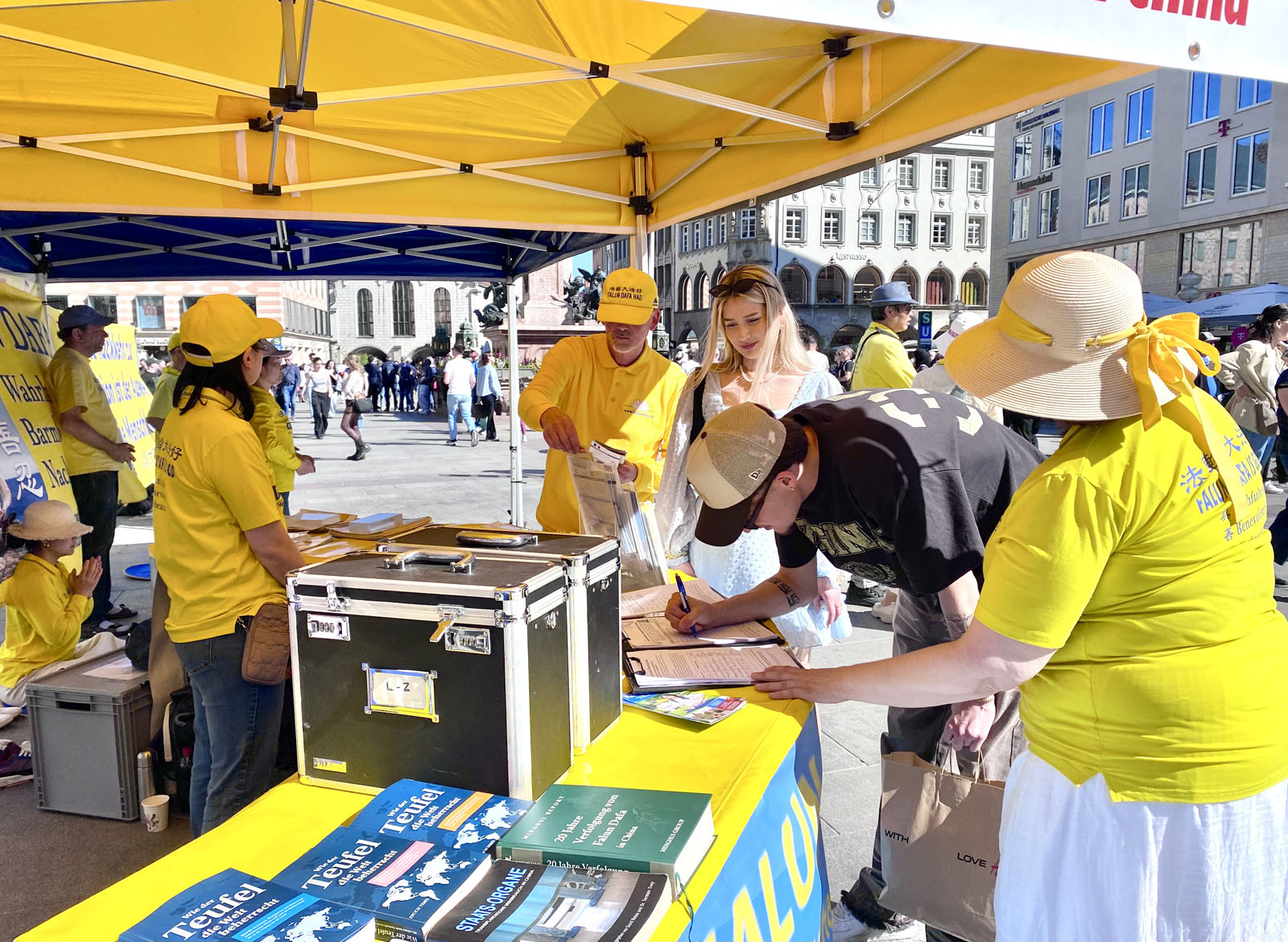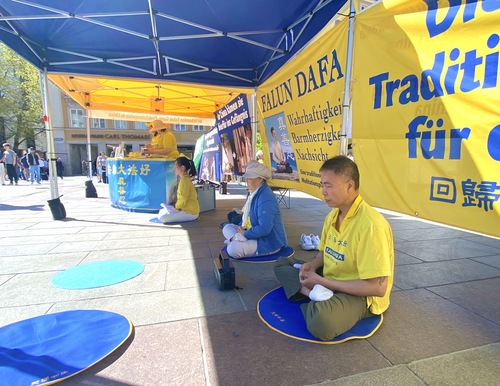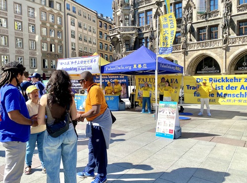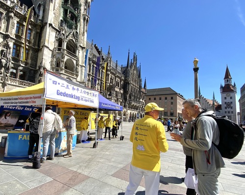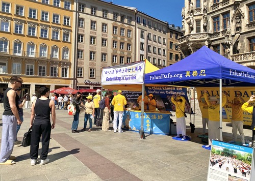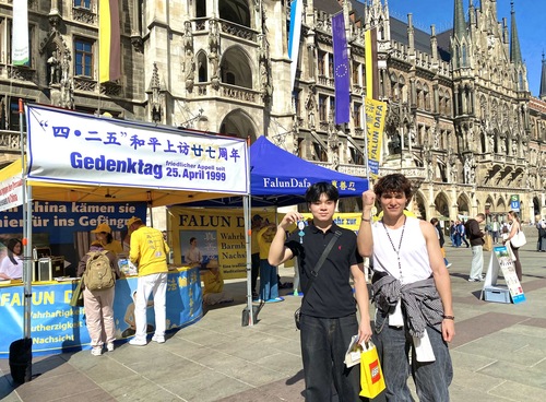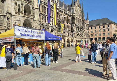 (Minghui.org) 25 апреля 2026 года практикующие Фалунь Дафа провели мероприятие на площади Мариенплац в Мюнхене, третьем по величине городе Германии, в память о мирном обращении, состоявшемся в Пекине 27 лет назад. Прохожие высоко оценили это мероприятие. Несколько китайских студентов и туристов, узнав о том, как жестоко режим обращается с практикующими, приняли решение разорвать связь с компартией Китая (КПК).