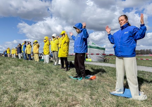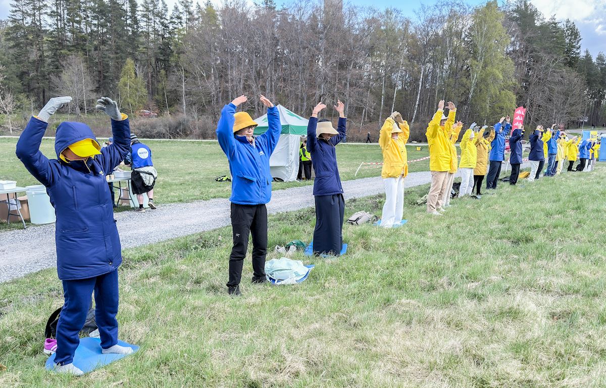 Практикующие выполняют упражнения перед посольством Китая в Стокгольме 25 апреля 2026 года