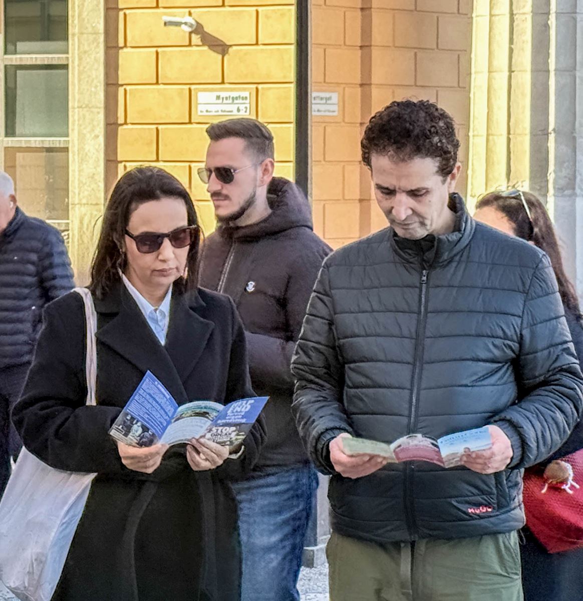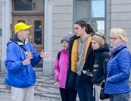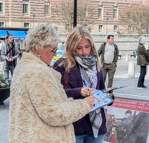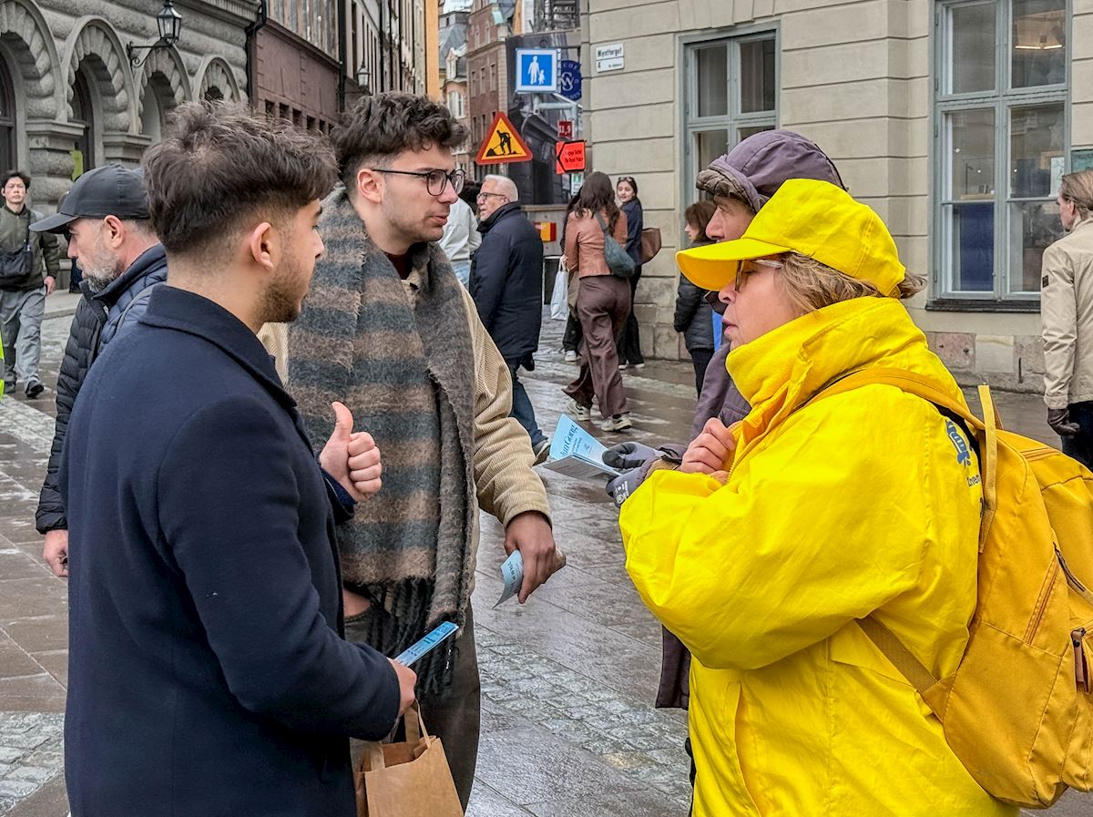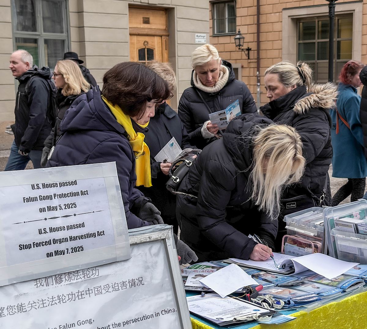 25 апреля 2026 года практикующие также провели мероприятие возле здания парламента в центре Стокгольма. Они рассказывали людям о преследовании Фалуньгун компартией Китая и санкционированном государством насильственном извлечении органов, а также о транснациональных репрессиях. Последователи Дафа призвали шведское правительство помочь остановить эти нарушения прав человека.