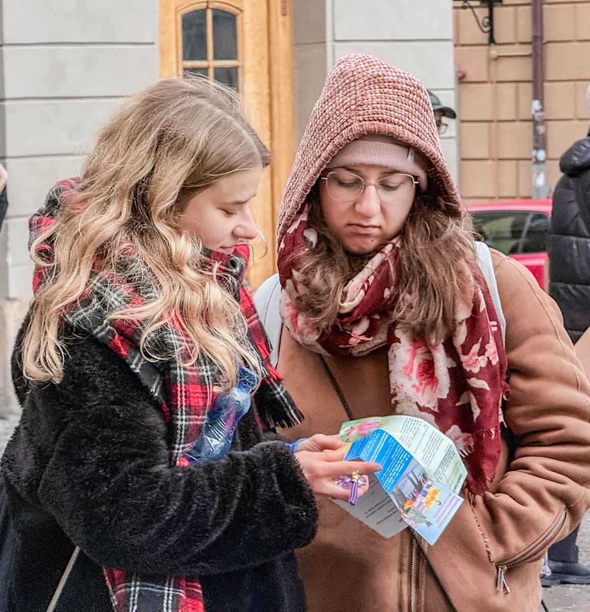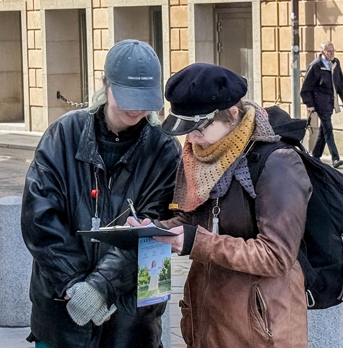 Прохожие общаются с практикующими, чтобы узнать о цели проведения мероприятия