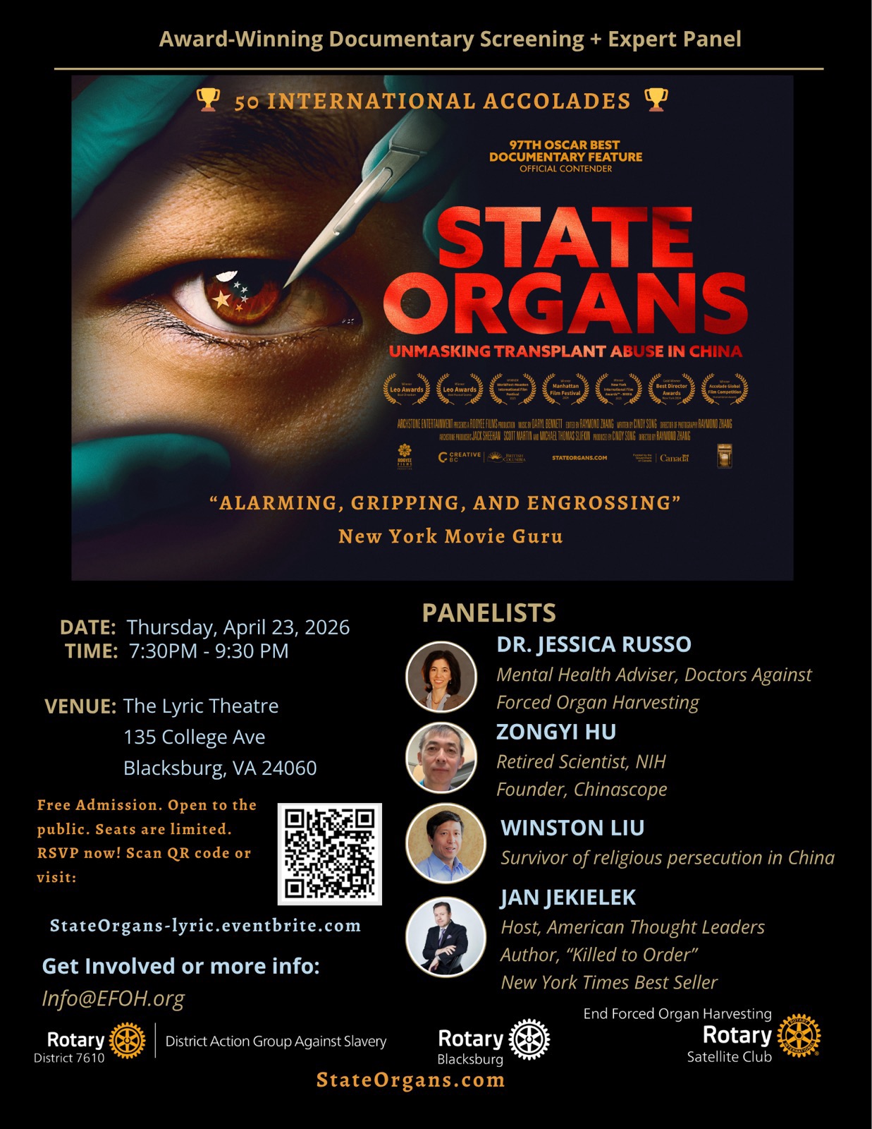 Мероприятие, организованное Ротари-клубом Блэксбурга и округа Монтгомери в партнёрстве с филиалом Ротари-клуба «Покончим с насильственным извлечением органов» (EFOH), а также окружной инициативной группой против рабства (округ 7610), объединило показ фильма, экспертный анализ и свидетельства очевидцев, чтобы пролить свет на предполагаемые злоупотребления, которые всё чаще вызывают озабоченность в международном сообществе.