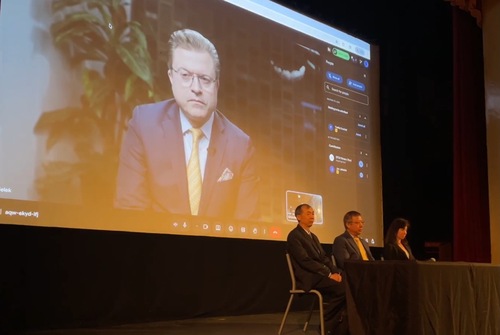 Приглашенные гости отвечали на вопросы зрителей. На экране Ян Екелек, журналист, ведущий программы «Американские лидеры мысли» и автор бестселлера New York Times «Убийство по заказу». В первом ряду, слева направо: Ху Цзунъи, бывший научный сотрудник Национального института здравоохранения (NIH) и основатель Chinascope; Уинстон Лю, переживший религиозные преследования в Китае; доктор Джессика Руссо, консультант по вопросам психического здоровья организации «Врачи против насильственного извлечения органов» (фото предоставлено организаторами мероприятия)
