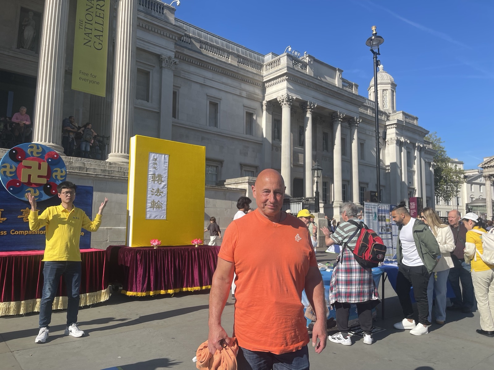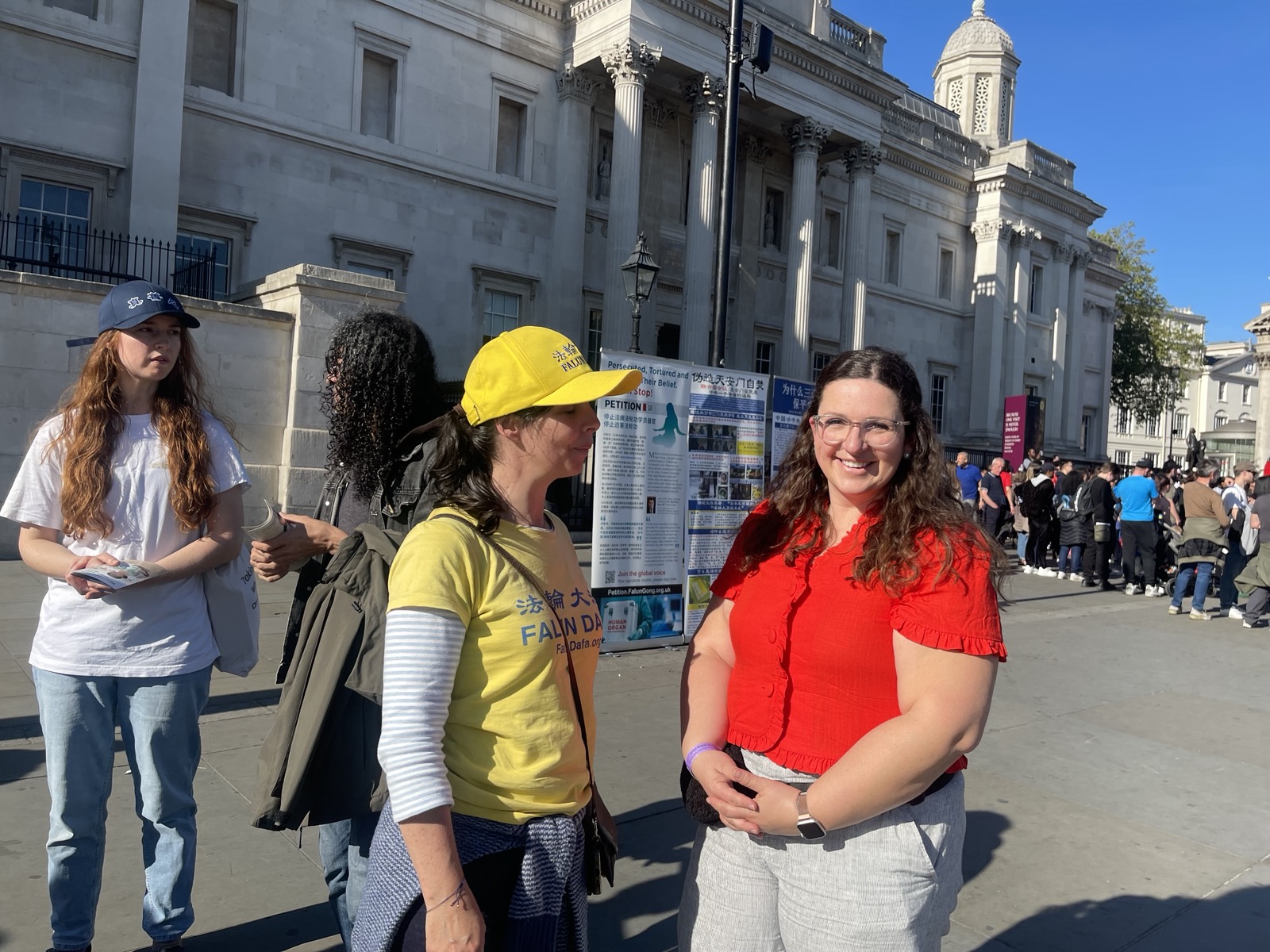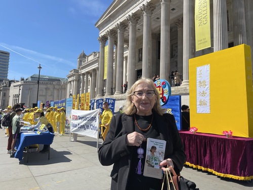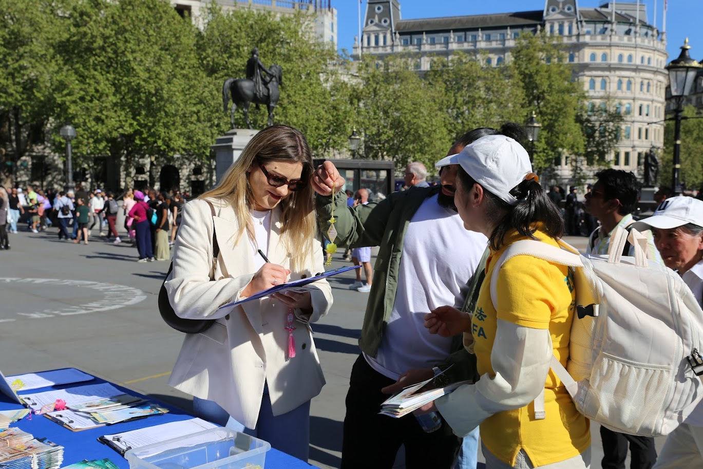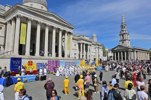 Практикующие провели мероприятия на Трафальгарской площади 25 апреля 2026 года, во время которых рассказывали людям о преследовании в Китае
