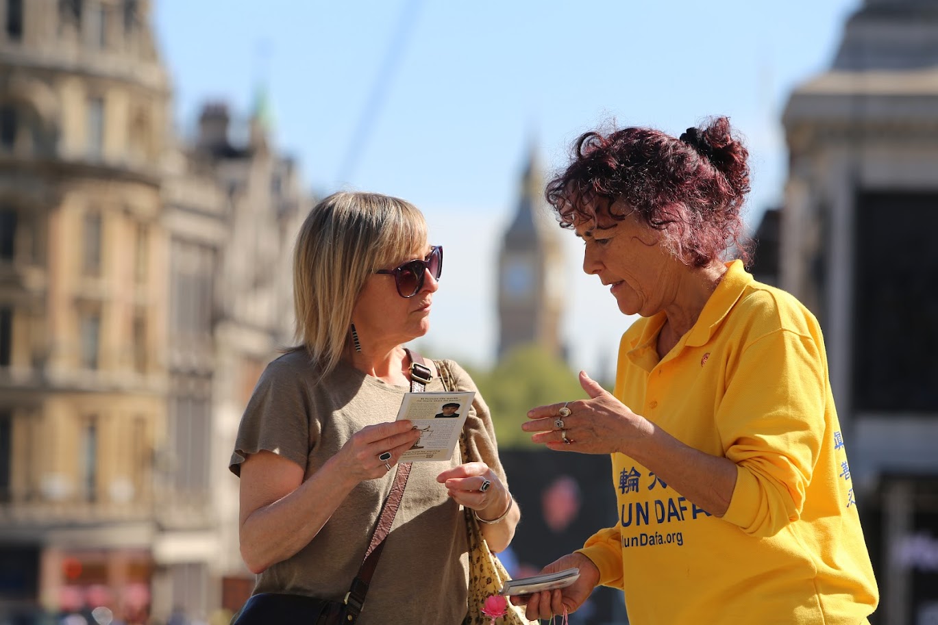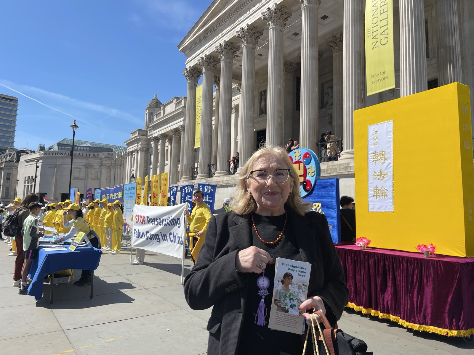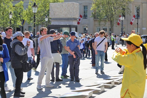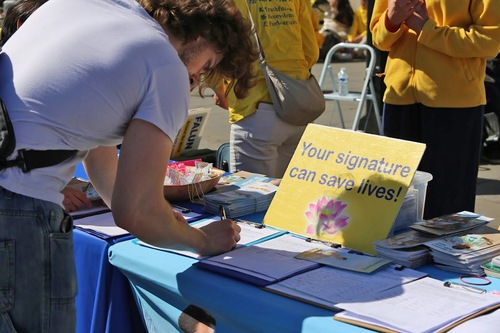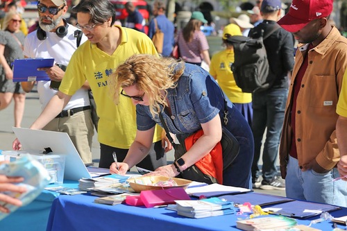 Многие люди останавливались, с интересом наблюдая за происходящим, делали фотографии и записывали видео. Они брали информационные буклеты и подписывали петицию, призывающую остановить преследование Фалуньгун в Китае.