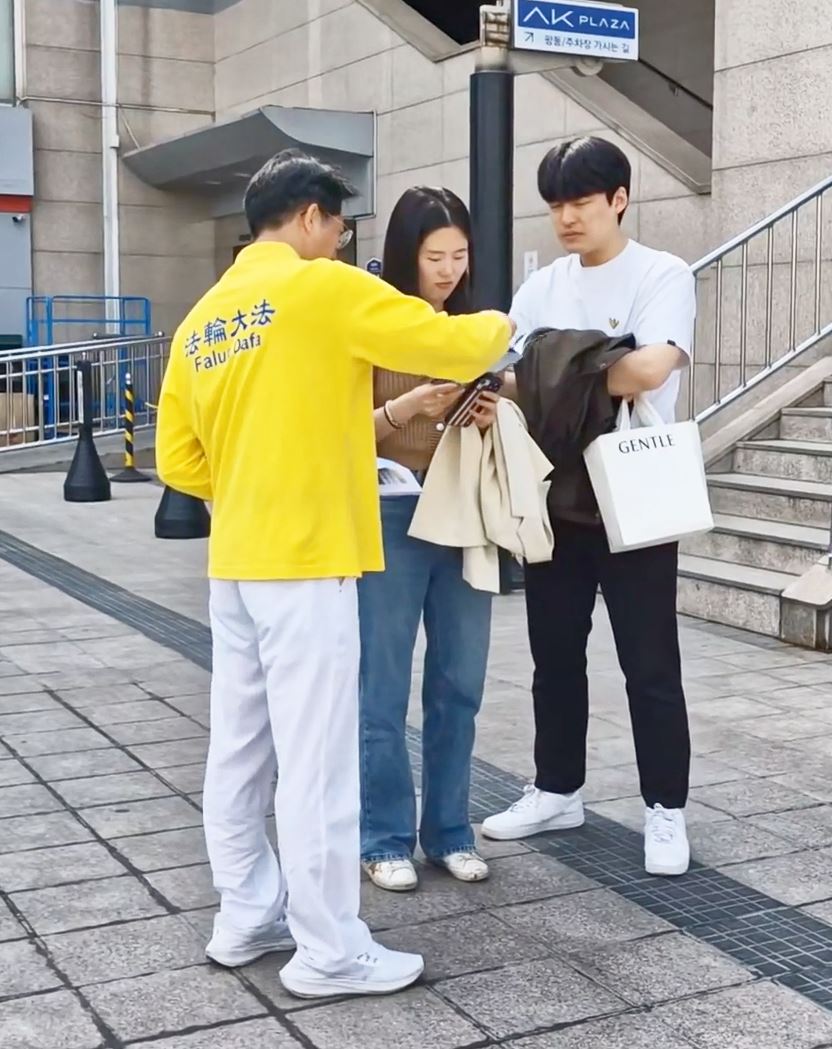 Местный житель спросил, для чего практикующие Фалуньгун проводят свои мероприятия на вокзале. Ким объяснил, что принципы Фалуньгун «Истина, Доброта, Терпение» уходят корнями в традиционную китайскую и азиатскую культуру. Именно поэтому эту практику хорошо принимают в более чем 100 странах мира. Она действительно приносит пользу людям, включая тех, кто живёт в Южной Корее.