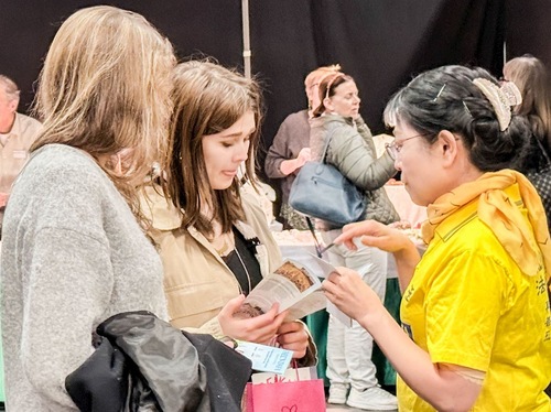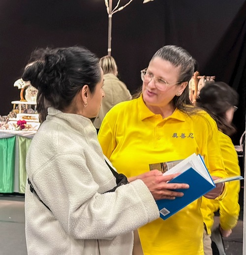 Биляна (справа) знакомит посетительницу выставки с Фалунь Дафа